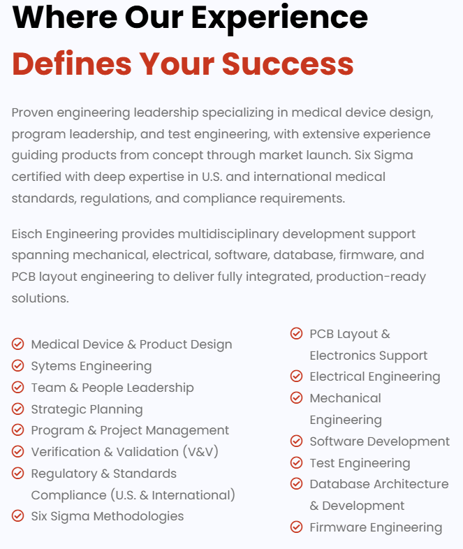 Proven engineering leadership specializing in medical device design, program leadership, and test engineering, with extensive experience guiding products from concept through market launch. Six Sigma certified with deep expertise in U.S. and international medical standards, regulations, and compliance requirements.
